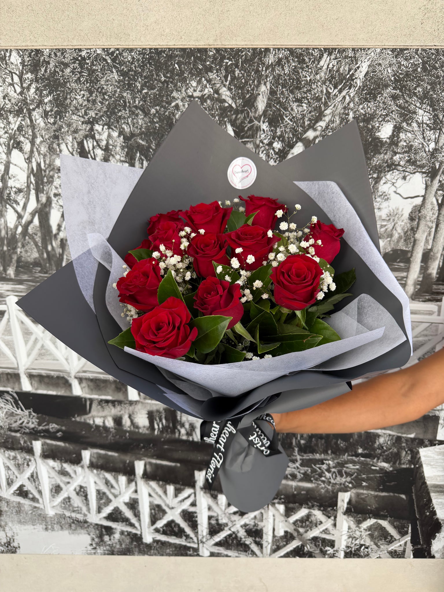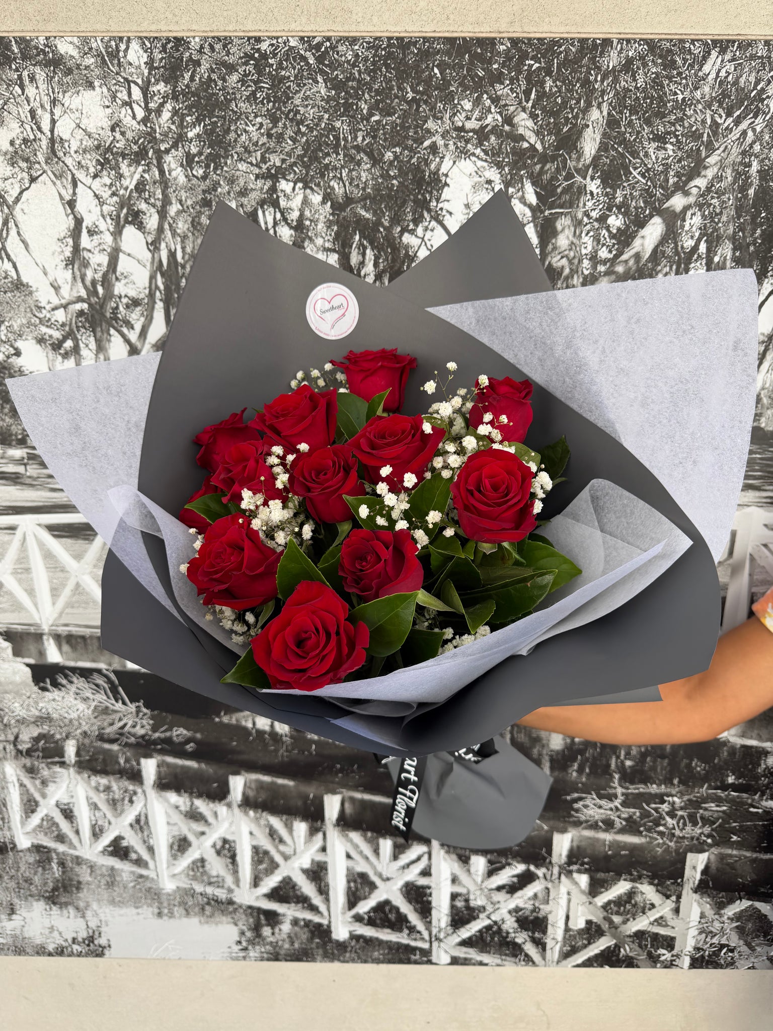 A gorgeous bunch of 12 Red Roses and seasonal greenery that will be appreciated for any occasion including Valentines Day Sydney, Love, and Romance and Anniversary.