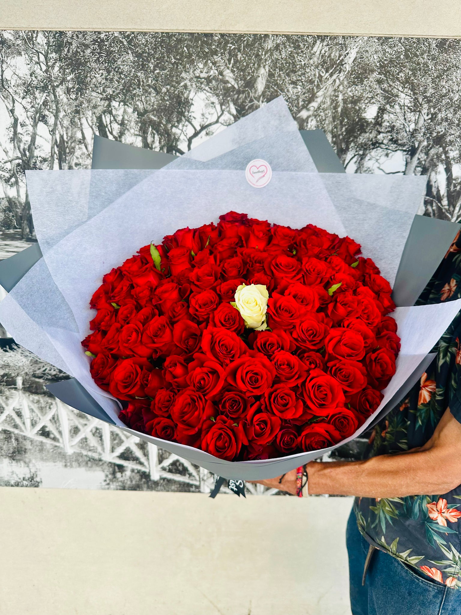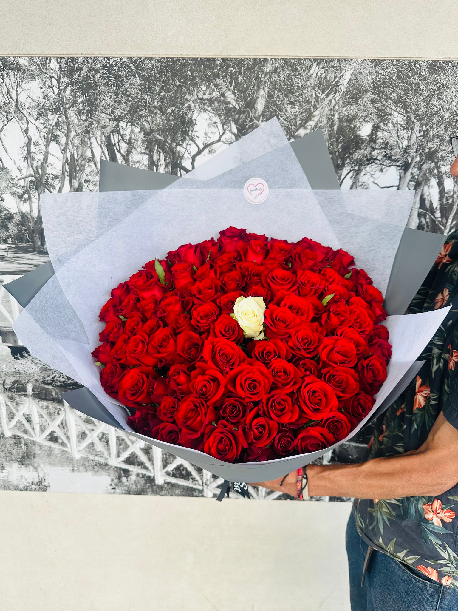 49 or 99 stunning red roses with 1 timeless white rose in the middle, made with love and beauty this stunning red rose valentines bunch will be sure to impress.
